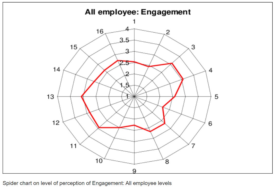 Many years ago, I was at a corporate offsite seated at a banquet round table in a sea of identical round tables filled with colleagues from across the country. In between presentations from executives was a session where the results of an employee sentiment survey were being shared. And that is how I came to learn about spider (or radar) charts. They look like this: