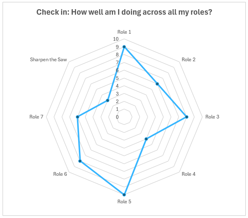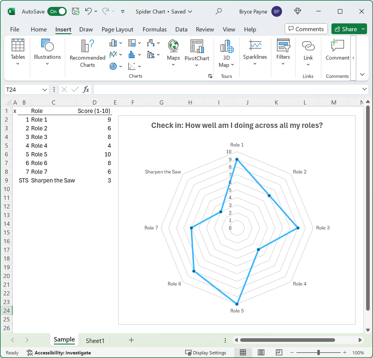 To do this, just input your roles and ratings and then Insert | Radar chart. (If you’d like to use the template I created, send me an email).