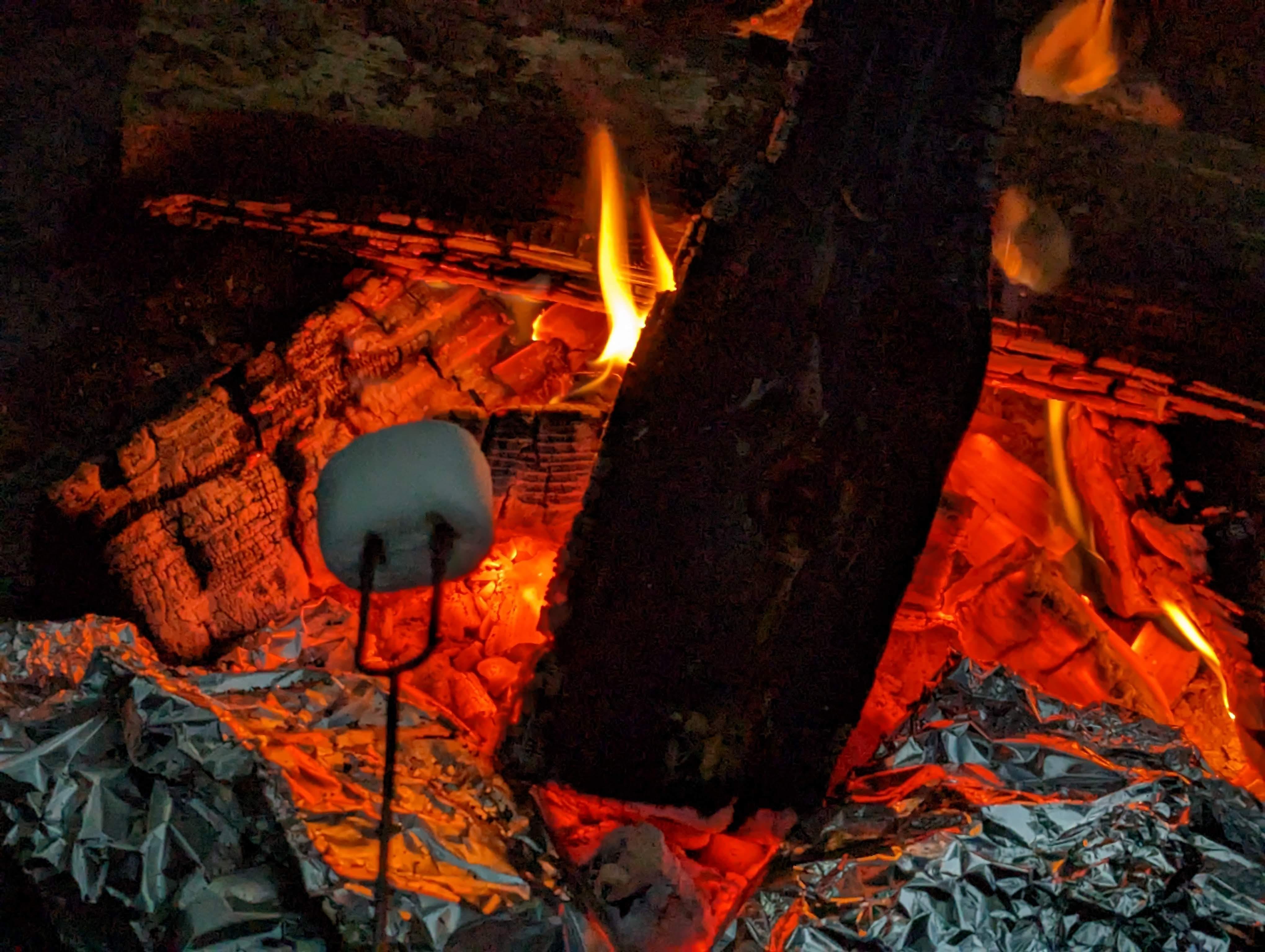 As the fire matured and the embers began to form, it was time to move our foil packet dinners down to the coals — and also start making s’mores.