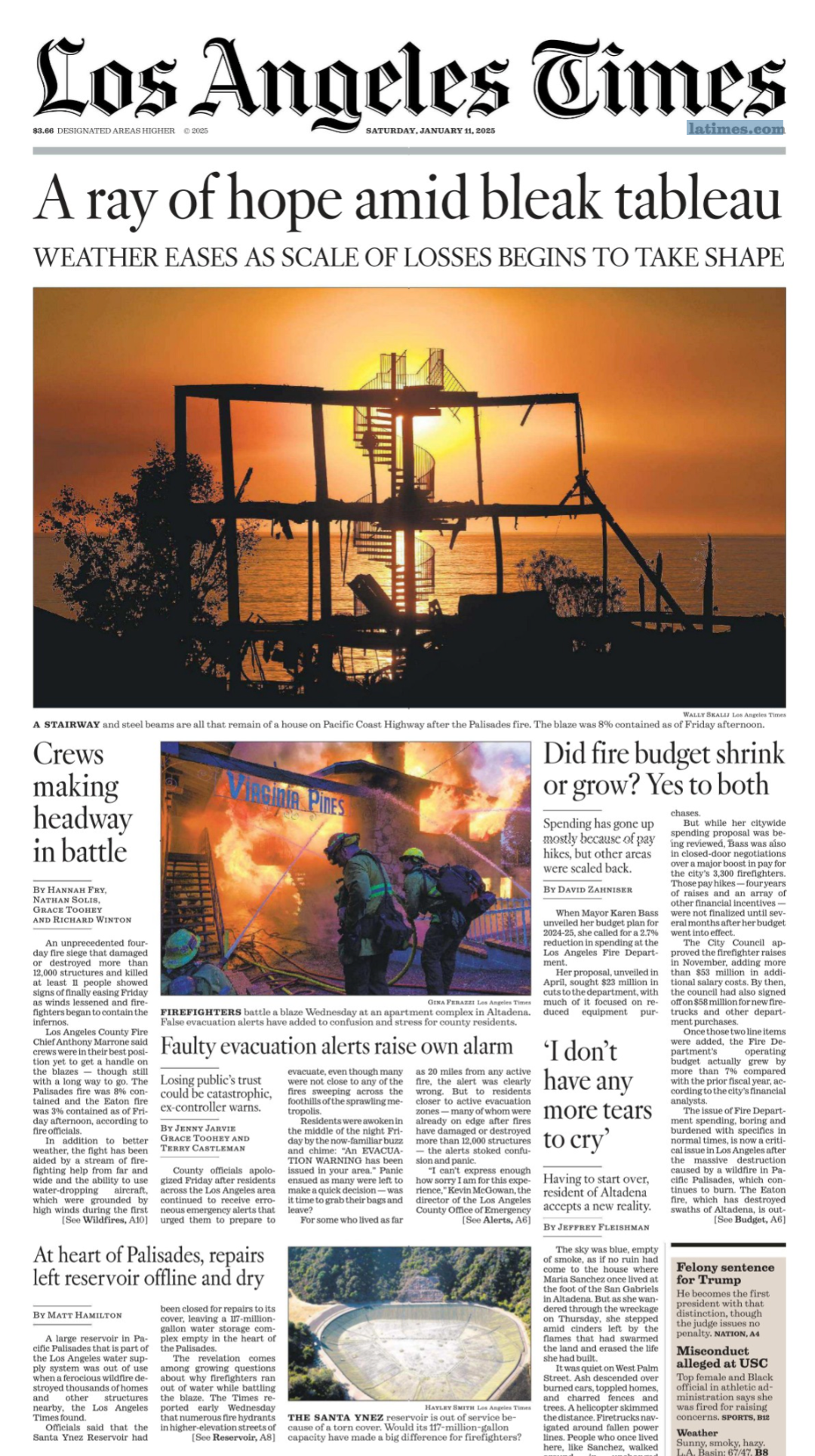 The stunning devastation that engulfed Pacific Palisades, Altadena and other neighborhoods entered the national consciousness through wall-to-wall TV news coverage, overshadowing major news events such as the funeral of former President Carter and the sentencing of Donald Trump in his New York hush money case. The unprecedented inferno filled screens with shocking images since Tuesday.