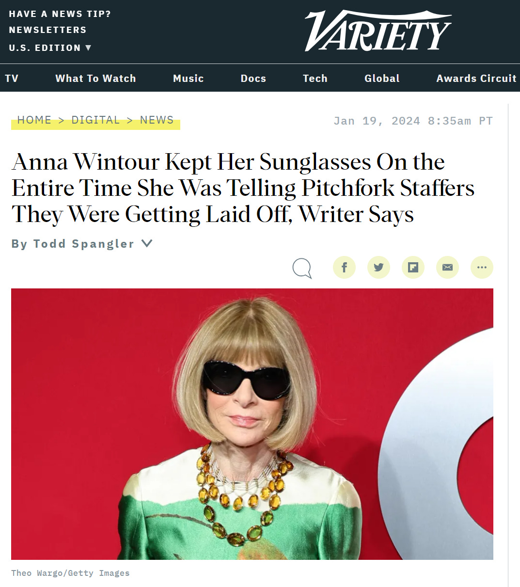 “One absolutely bizarro detail from this week is that Anna Wintour — seated indoors at a conference table — did not remove her sunglasses while she was telling us that we were about to get canned,” Allison Hussey, a former Pitchfork staff writer, wrote on X. “The indecency we’ve seen from upper management this week is appalling.” (source)