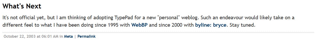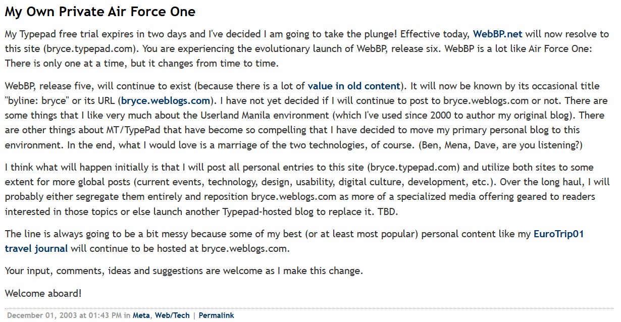 By December 2003, however, I had decided to formally adopt TypePad as a web publishing platform, writing at the time: