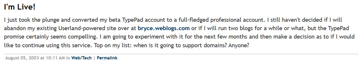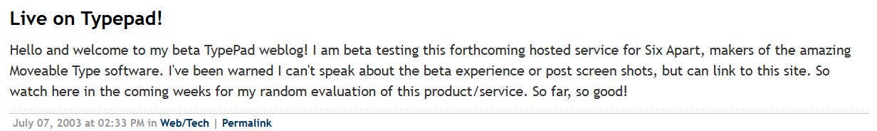 In July 2003, I started testing a new Six Apart offering, TypePad, which was essentially a hosted version of Moveable Type. Here was my first post: