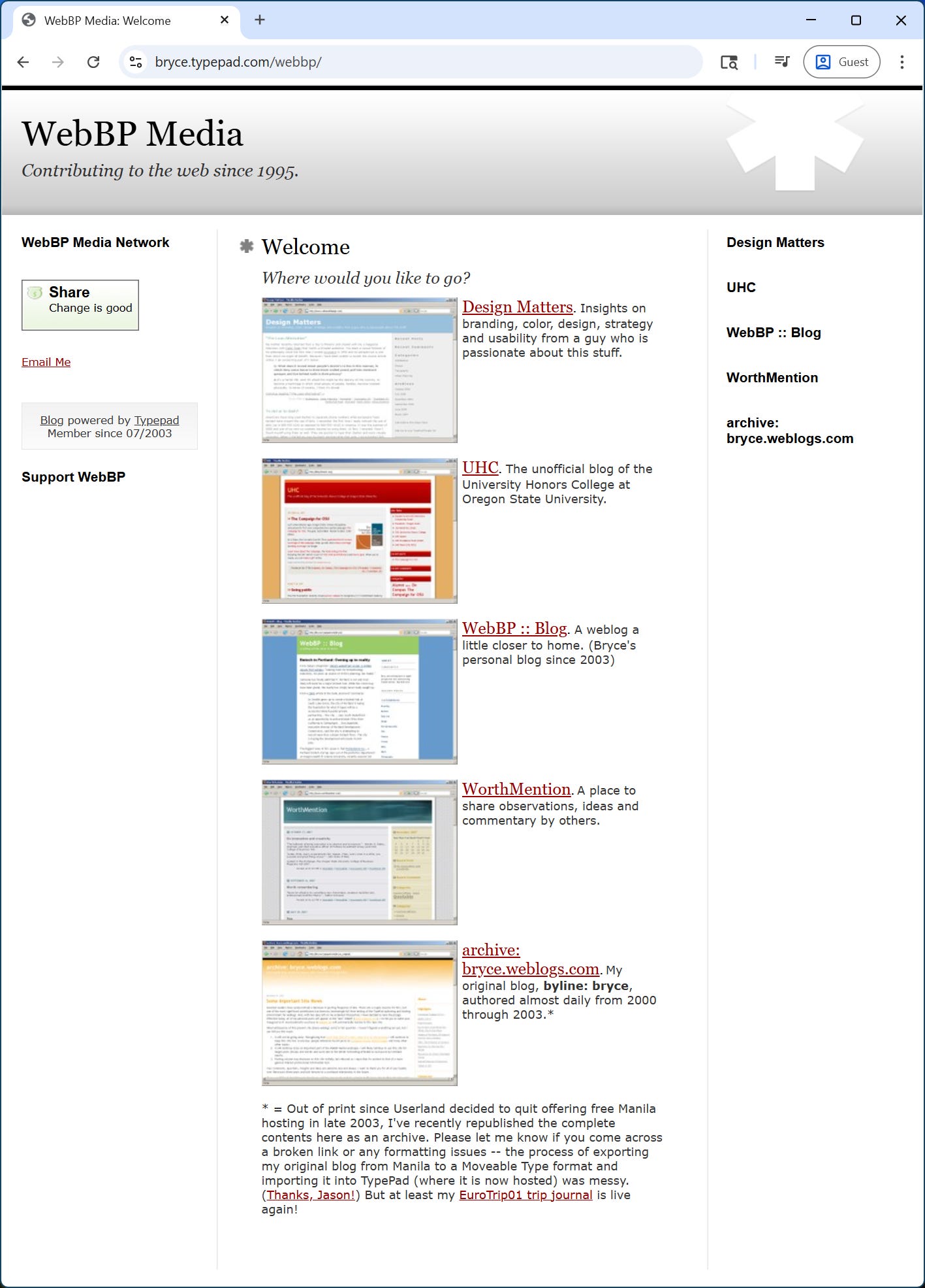 Over time, Typepad would become home to multiple publications. Here is a screenshot of a legacy WebBP Media home page featuring a few.