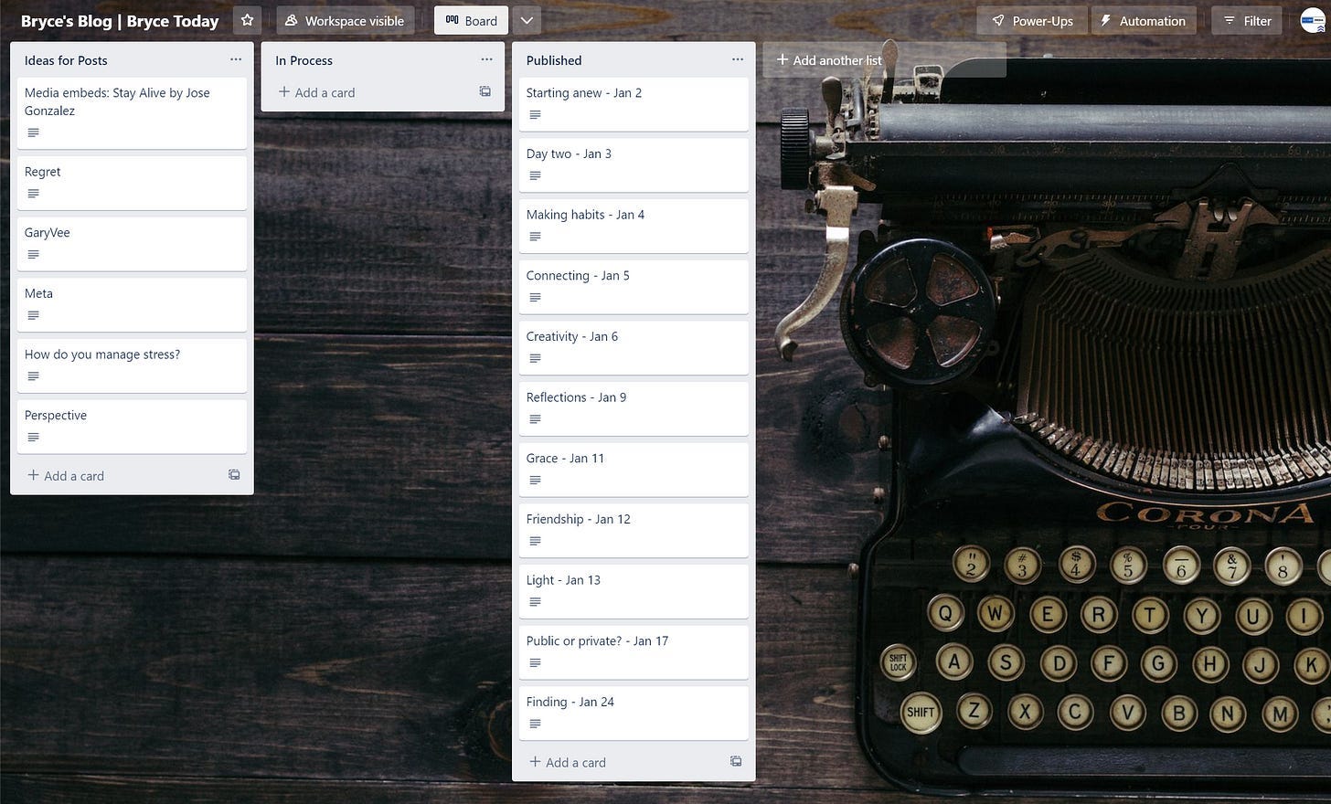 As I was writing my last post, I decided to get more organized. Meet Trello.