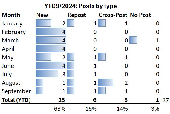 posts so far this year by type:1This was eye opening for me to see. As August got busy (I was essentially off the grid in grad school for two full weeks), I knew I had leaned into cross-posting other posts, but I hadn’t realized until now that I neglected to take a week off in June.
