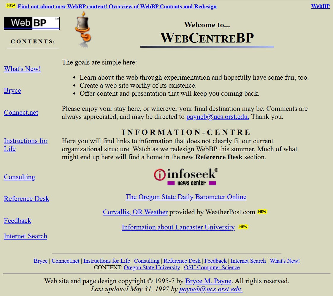 By October 1995, the home page of my personal website was in its third version and I had settled on calling it WebCentreBP. Here is a screen shot of the oldest archived version: